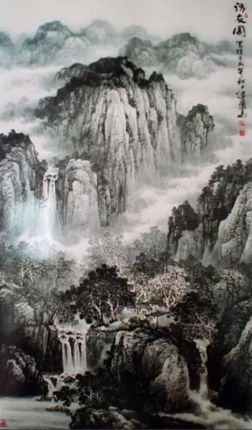 汪国岛作品的积墨画技其实用得不多,他追求的只是通过笔墨的浓淡处理,使作品具有厚重的效果。在构图上,他也避免了黄宾虹“黑密”的布局,尽量做到疏密有致。以《井冈山》为例,从前景的山石到远景的云水,构图饱满,浓墨一片江水,瀑布云带只占画面的很少部分。因为浓墨,故显厚重:因为,疏朗,卓显明雅。