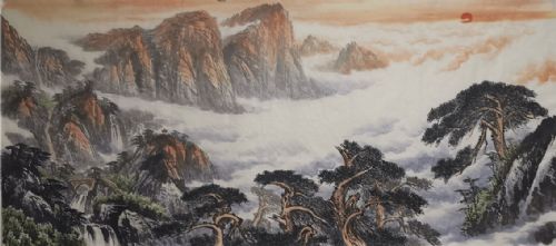 泰山有王者风范,所以画泰山一定要画出一种大度和大气,而不是专注于细节。这幅荣获第九届当代中国山水画展终身成就奖的泰山题材山水画巨作,工写兼备,层次感强,山之大气,松之茂盛,旭日之蓬勃,皆宛在眼前:环绕在山间的云雾,缥缈朦胧,似动非动,衬托出泰山的壮观。整幅巨作不论从画面营造,还是用笔设色上都别具一格,皴染浓浓泰山情,为观赏者带来美妙的视觉享受。拿此幅山水画来说,画面中的太阳为旭日东升,鸿运当头,如日中天...... 通往南天门的台阶有步步高升、步步为赢的含义。光明顶是泰山的最高峰,也是十八盘的尽头,经过千辛万苦登上泰山的最高处,有一种“山登绝顶我为峰”的豪迈。泰山是五岳独尊,五岳之首,而且这幅泰山图画面中没有水,特别适合调补风水用。几十年来的守望泰山,描绘泰山,让画家顾家深对泰山有了一种无法割舍的情愫。他也渐渐明白,画泰山不仅仅是画它的形,更重要的是它的神、它的韵,只有用心去感受泰山,深深挖掘出泰山文化,才能创作出感人的泰山作品。