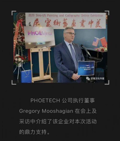 在新闻发布会上,Phoetech集团执行董事Gregory Mooshagian介绍了企业;艺术展的宣传主任Lucy 朱分别介绍了《美中时报》和亚凯迪亚艺术学院亚凯迪亚艺术学院;组委会执行主席、艺术委员会秘书长宋轲介绍艺术展艺术委员会和画册的情况;美国南加州华人社团联合会主席陈慧碧致辞,预祝艺术展取得圆满成功。临时有事未能到场的好莱坞明星大学董事长、美中经贸文化促进会常务副会长张玲通过微信等,表达了艺术云展的期许,也感谢各界体的大力支持。