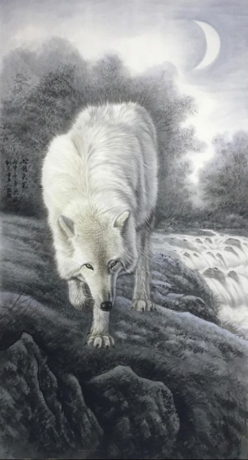 相比之下,我更欣赏先生的众幅狼作,这是因为先生所画的狼,不仅具有很强的视觉艺术效果,同时他在狼毛的细节处理上也是有着很强的质理感!而这皆要得益于他笔法上的灵活,狼身体上的每一个形态,甚至每一个细节,都是有着一定的视觉规律,而这种视觉规律堆砌起来,便使得整个狼体显现自然,皮毛有密度,肌理有力度!狼眼更是穷尽点睛之妙,充满野味!可以说,先生的众幅狼作,不但完美刻画出了狼所具有的警觉感,他更是将狼的狠劲与野性统统在画纸上展现了出来!