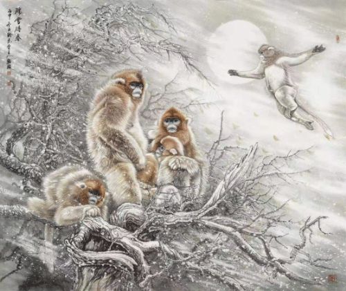 先生画猴,不以迅捷顽皮为中心,而是以猴子的智慧为主态,纳祥瑞而脱俗气,取朴质而展形象!在画虎创作上,先生亦是如此,其虎以工笔而出,形神精工,威猛霸气!时以秋作,时以冬作,画中常添草饰,以将整个画面的张力显的更为自然!冬作配以雪白大地,又以寒月高风为境,老虎扭头而视,王者之风,可见一斑!观之可谓遐想无限。
