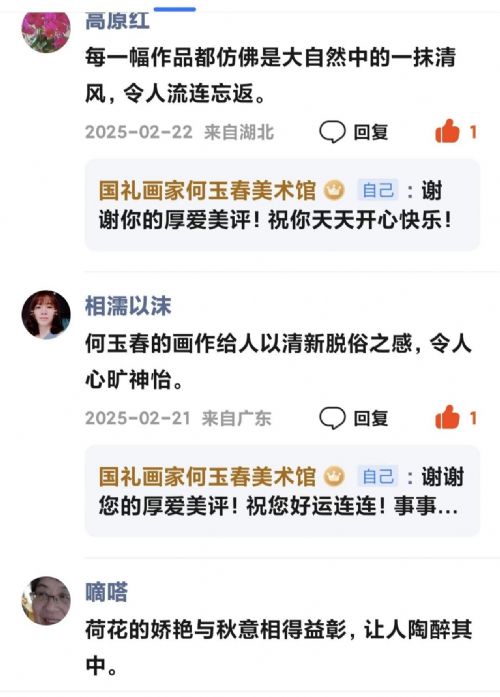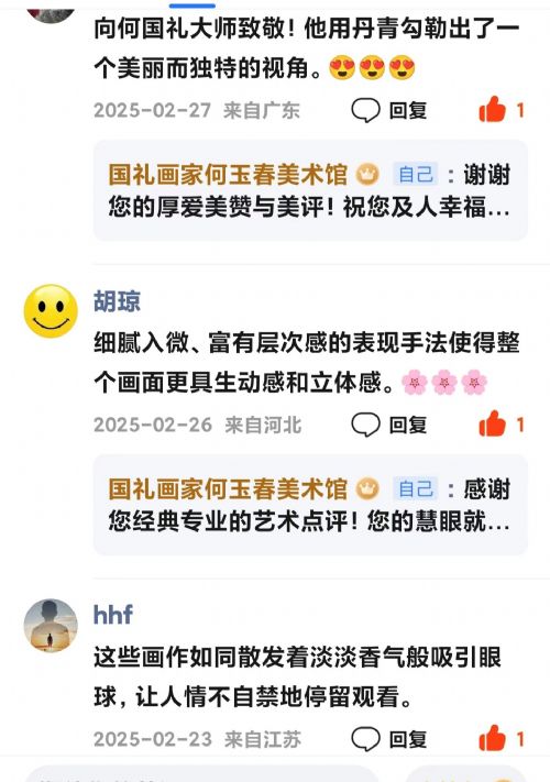 作为“国礼画家”,何玉春的作品不仅是技法的呈现,更是文化精神的传递。当观者在画中“感受到生活中的点滴美好”(《夺》评),当“艺术的无限魅力”(《随心随性随缘》评)跨越地域与年龄,这种共鸣恰恰证明:好的艺术,既能扎根传统土壤,又能生长出现代人心底的向往。